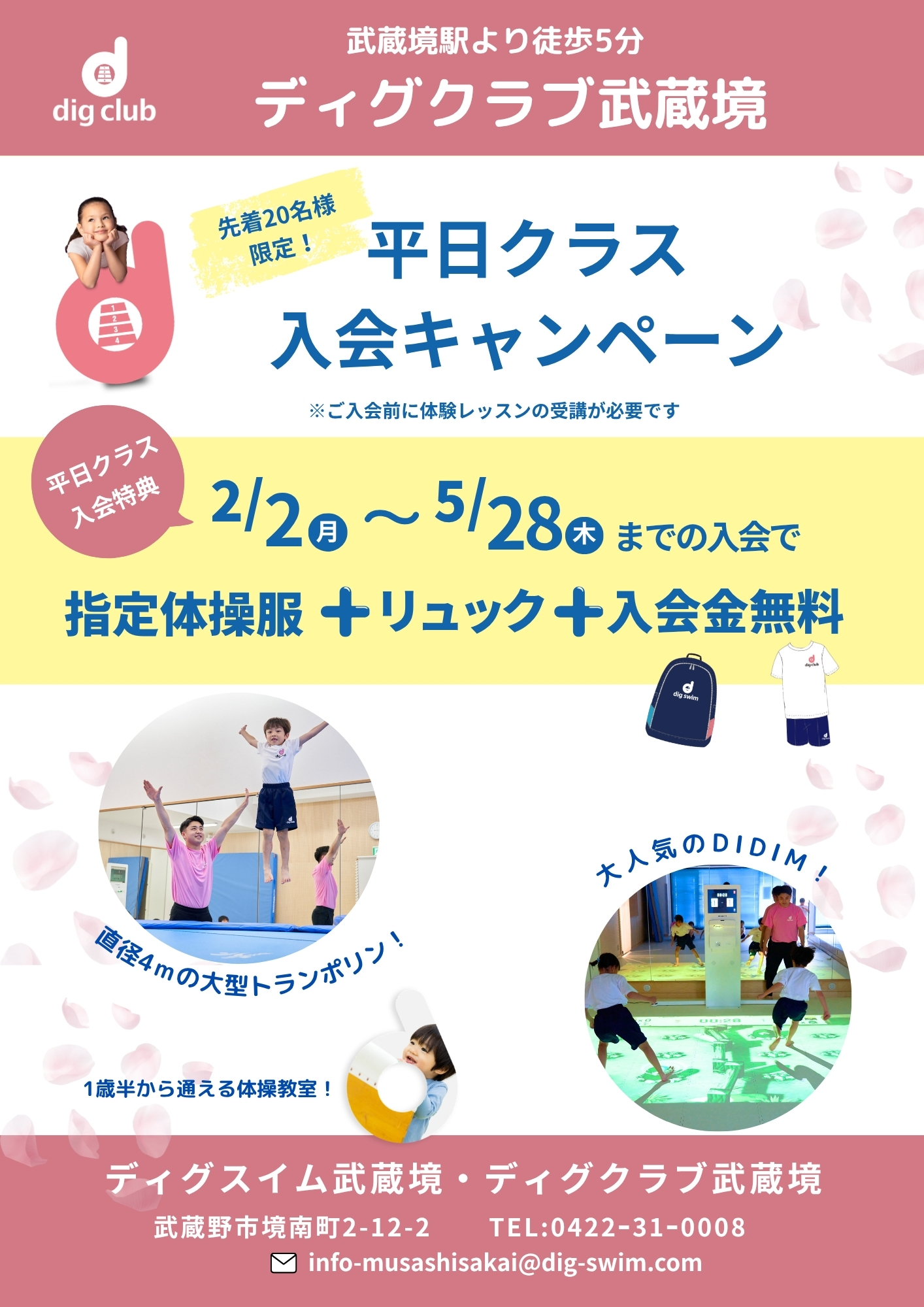 幼児・小学生・ミックスクラスはディグクラブ武蔵境指定の体操服とリュック(ディグスイム武蔵境と共通)を入会時にご購入ください。